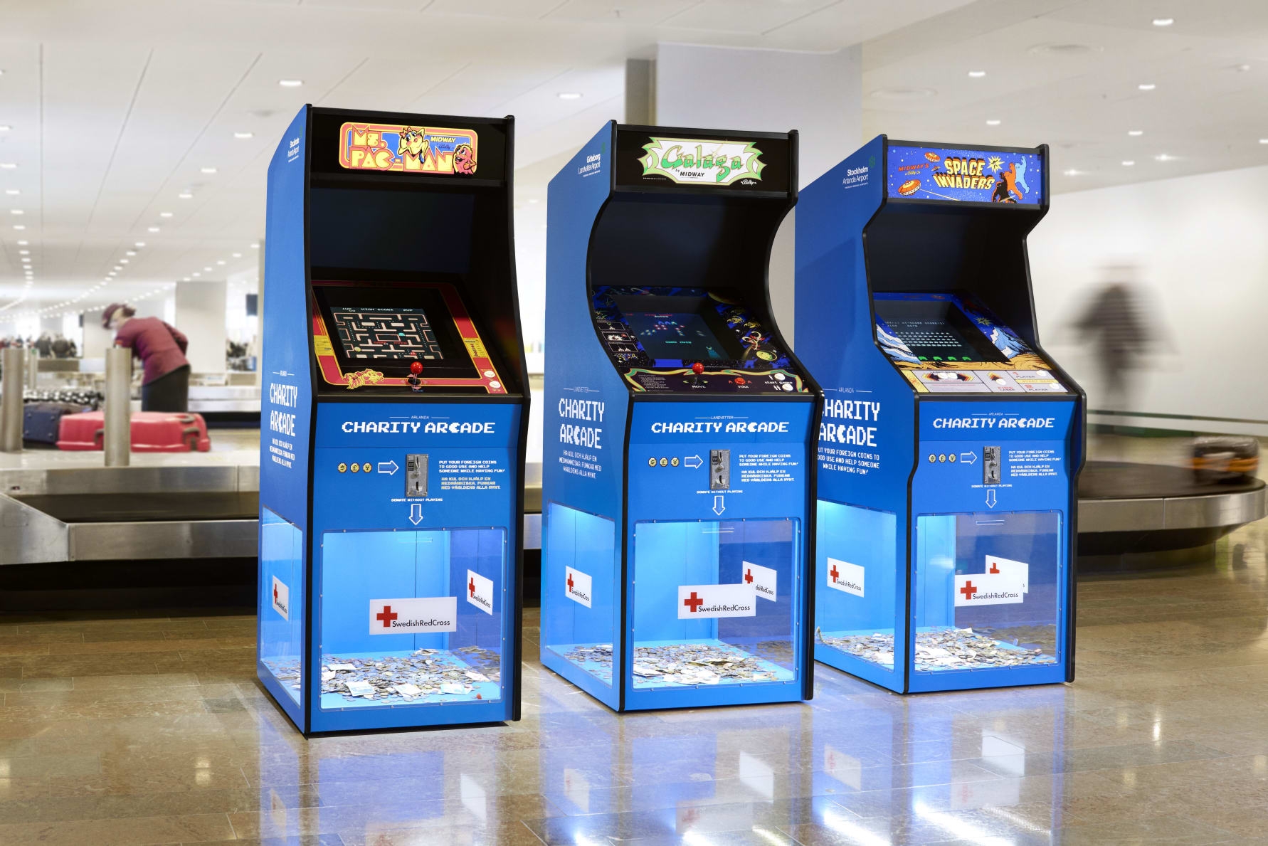 Ms. Pac-Man, Space Invaders and Galaga people visiting Sweden can now play some of the most celebrated and cult-declared arcade games while at the same time make use of their left-over travel coins, as they get donated to the Swedish Red Cross.