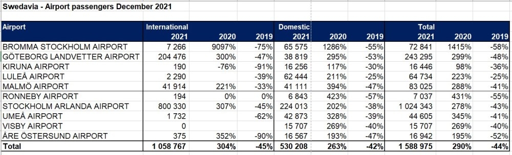 Göteborg Landvetter Airport had a total of 243,000 passengers in December. Compared to December 2020, passenger volume increased nearly 300 per cent, but it decreased 48 per cent compared to December 2019. The airport had more than 1,900,000 passengers for the full-year 2021, which was an increase of 21 per cent compared to 2020, but passenger volume was still more than 70 per cent lower than in 2019, before the pandemic.